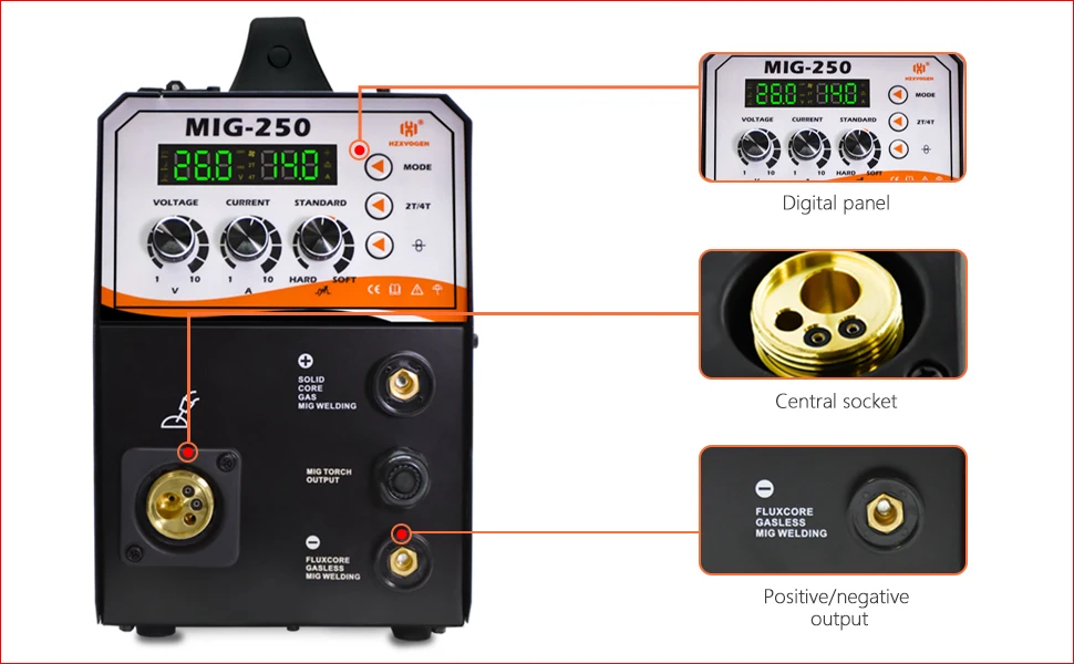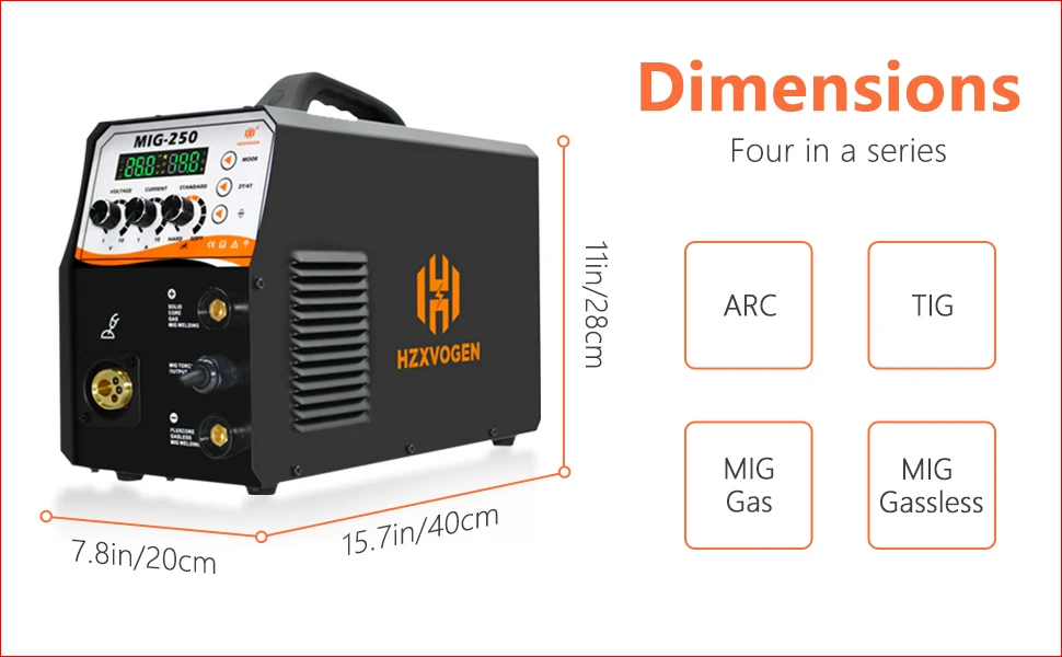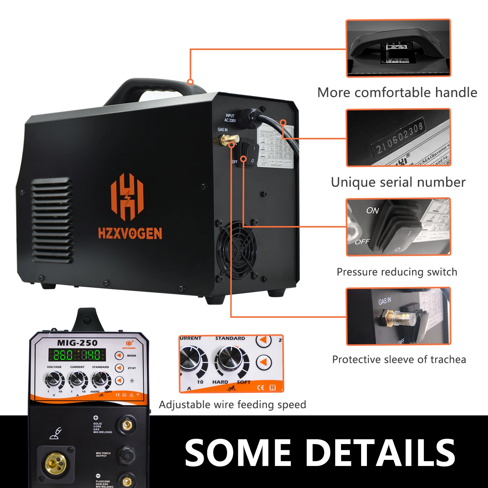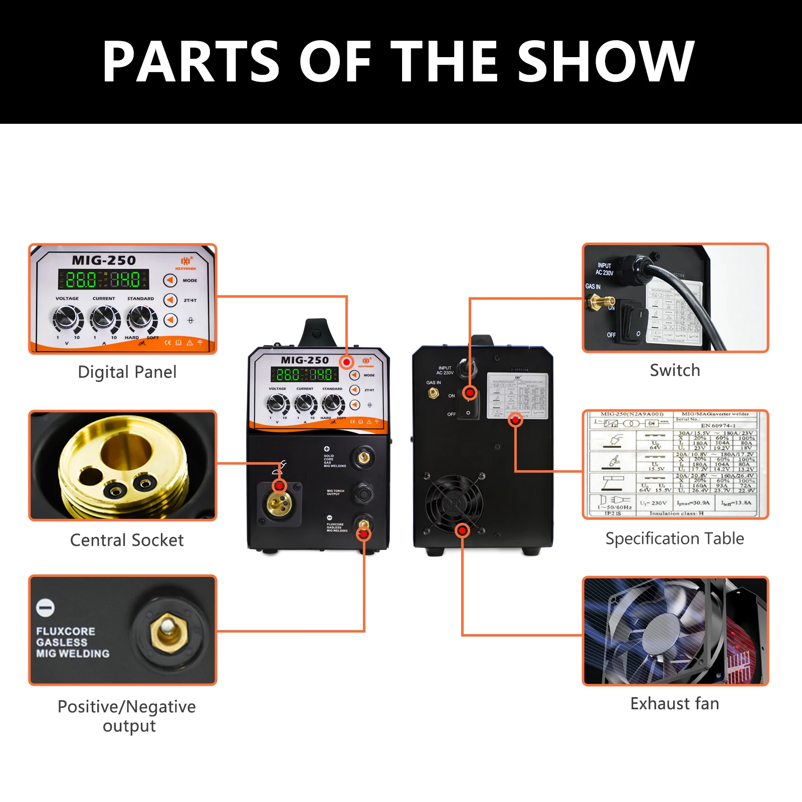 -【Ajuste digital】: "MODO" interruptor MIG/ARC/LiftTIG função, ajustar a corrente ea tensão livremente. A exposição nova da relação faz a soldadura trabalha exata e conveniente. O soldador HITBOX MIG250 Stick tem sua própria função de redução automática de tensão para reduzir a perda de fio de solda.