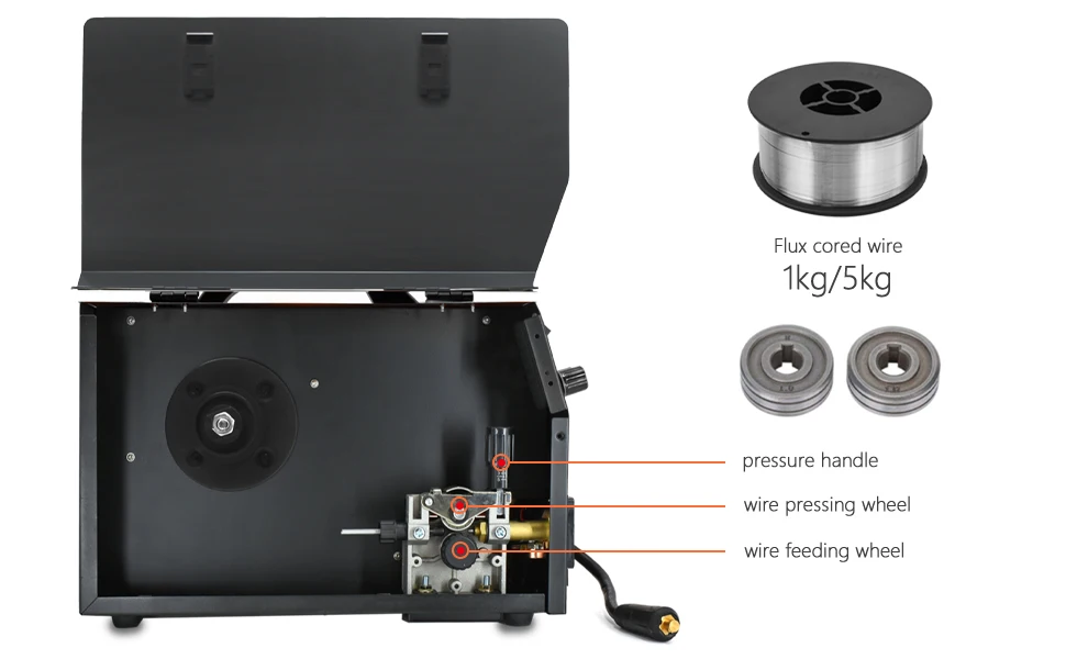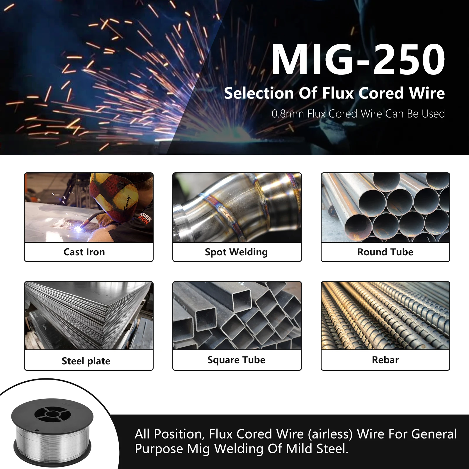 -【Suporte a gás e sem gaso】: Soldador inversor MIG pode suportar trabalho de soldagem a gás e sem gás, escolha o seu método de soldagem! Compatível com 1/5KG, 0.8/1.00mm fio do núcleo do fluxo. Nós igualmente adicionamos uma função nova do ajuste da velocidade da alimentação do fio para fazer a soldadura mais profissional. Diâmetro do eletrodo compatível: φ2.5/3.2/4.0.