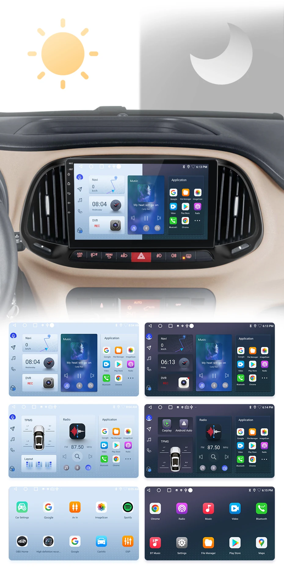 O rádio alternará entre os modos diurno e noturno usando os faróis do carro para ajustar o brilho geral da tela para combinar com o ambiente ao redor. Funções comuns são integradas na área de trabalho, permitindo que você alterne entre navegação, música, chamadas Bluetoo-th e outros recursos comuns com apenas um clique. O design personalizado da interface do usuário da Junsun aumenta a conveniência e a segurança durante toda a sua jornada;