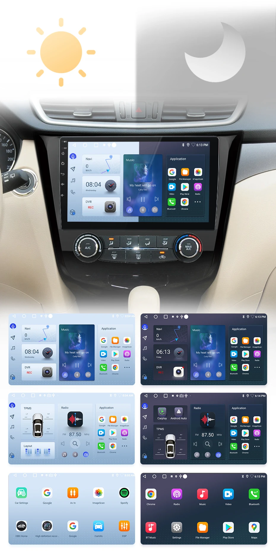 >> O rádio alternará entre os modos dia e noite usando faróis do carro para ajustar o brilho geral da tela para combinar com o ambiente circundante. Funções comuns são integradas na área de trabalho, permitindo que você alterne entre navegação, música, chamadas Bluetoo-th e outros recursos comuns com apenas um clique. O design personalizado da interface do usuário da Junsun aumenta a conveniência e a segurança durante toda a sua jornada;