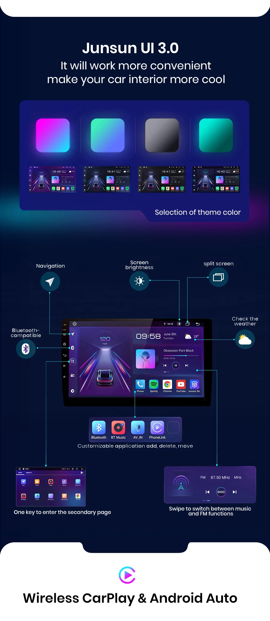 >> O rádio Junsun suporta Wireless CarPlay e Android Auto, permitindo que você use funções e aplicativos do smartphone, como navegação, música, chamadas e mensagens durante sua jornada. Proporciona uma experiência áudio de alta qualidade, melhorando o entretenimento e a conveniência da sua experiência de condução.