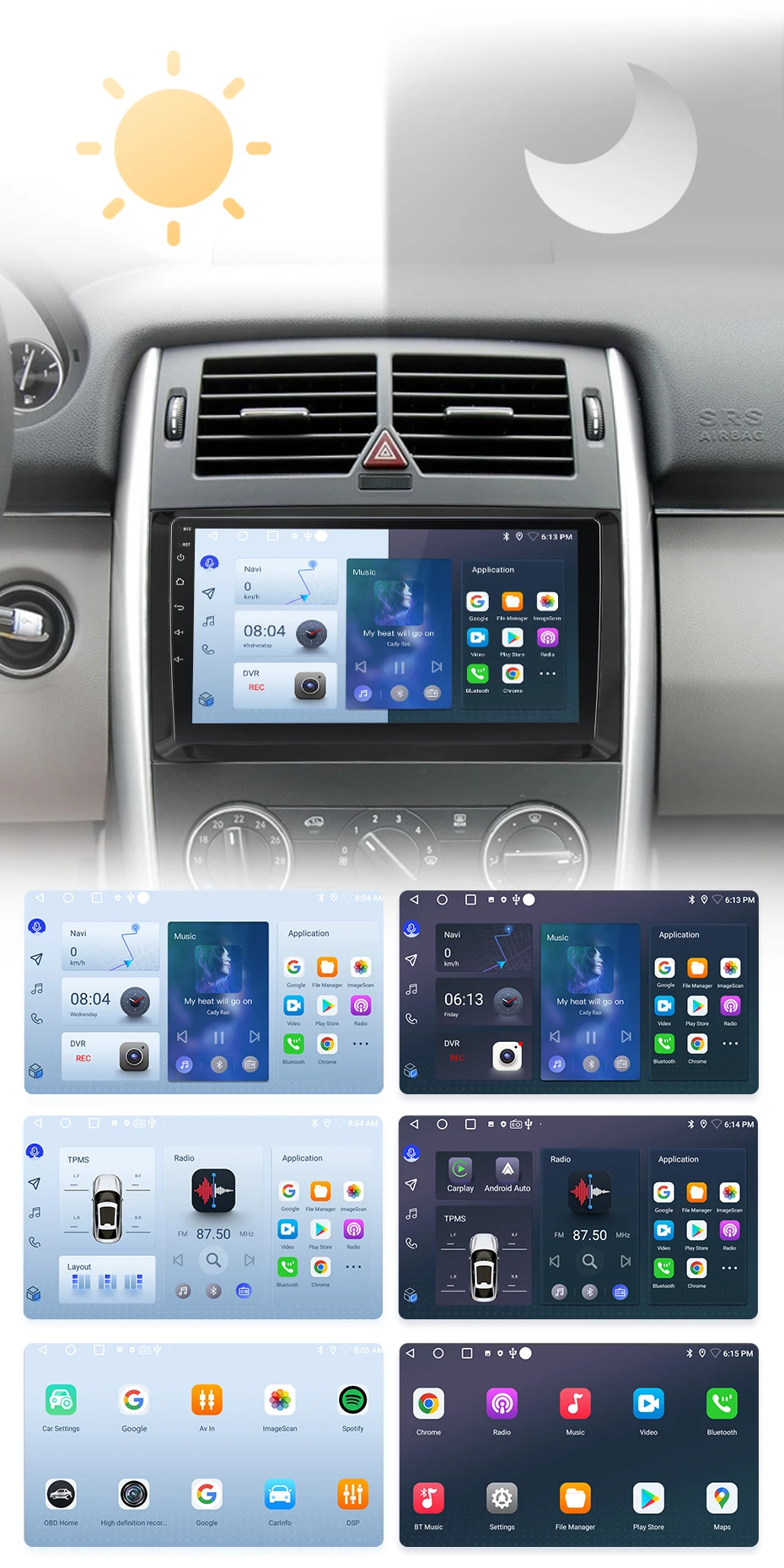 >> O rádio alternará entre os modos dia e noite usando faróis do carro para ajustar o brilho geral da tela para combinar com o ambiente circundante. Funções comuns são integradas na área de trabalho, permitindo que você alterne entre navegação, música, chamadas Bluetoo-th e outros recursos comuns com apenas um clique. O design personalizado da interface do usuário da Junsun aumenta a conveniência e a segurança durante toda a sua jornada;