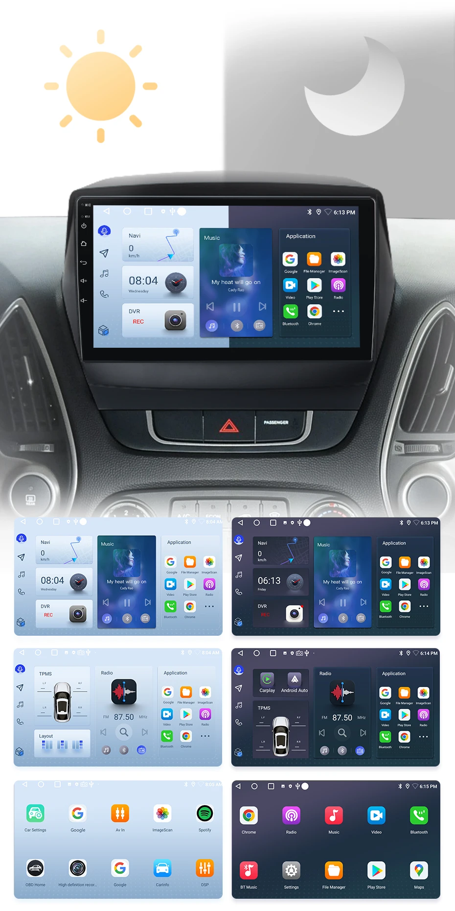 >> O rádio alternará entre os modos dia e noite usando faróis do carro para ajustar o brilho geral da tela para combinar com o ambiente circundante. Funções comuns são integradas na área de trabalho, permitindo que você alterne entre navegação, música, chamadas Bluetoo-th e outros recursos comuns com apenas um clique. O design personalizado da interface do usuário da Junsun aumenta a conveniência e a segurança durante toda a sua jornada;