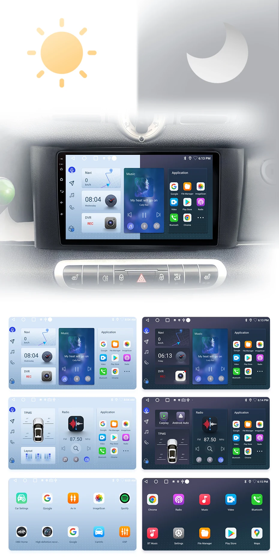 >> O rádio alternará entre os modos diurno e noturno usando faróis de carro para ajustar o brilho geral da tela para combinar com o ambiente circundante. Funções comuns são integradas na área de trabalho, permitindo que você alterne entre navegação, música, chamadas Bluetoo-th e outros recursos comuns com apenas um clique. O design personalizado da interface do usuário da Junsun aumenta a conveniência e a segurança durante toda a sua jornada;