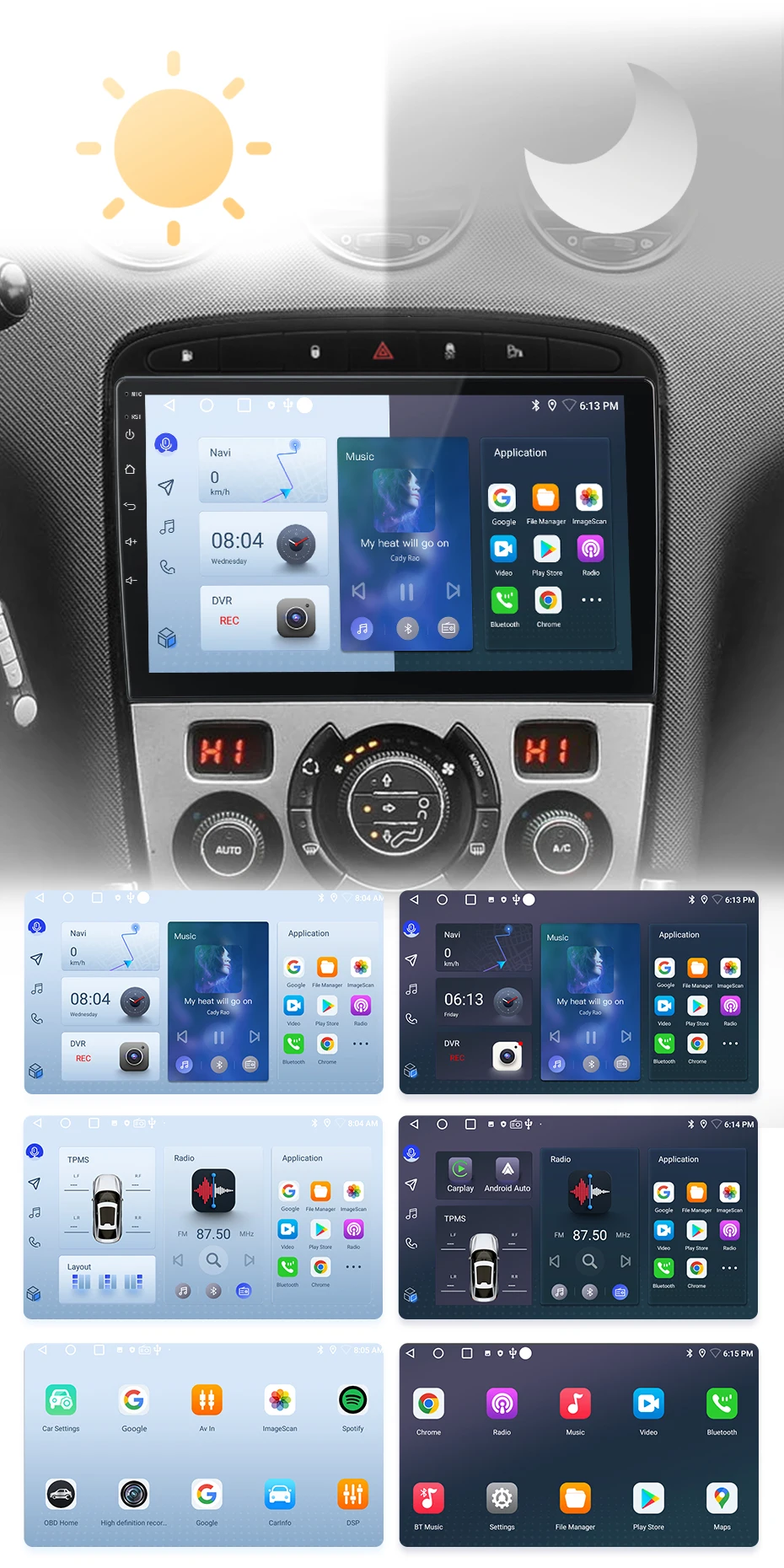 >> O rádio alternará entre os modos dia e noite usando faróis do carro para ajustar o brilho geral da tela para combinar com o ambiente circundante. Funções comuns são integradas na área de trabalho, permitindo que você alterne entre navegação, música, chamadas Bluetoo-th e outros recursos comuns com apenas um clique. O design personalizado da interface do usuário da Junsun aumenta a conveniência e a segurança durante toda a sua jornada;
