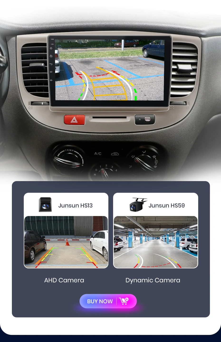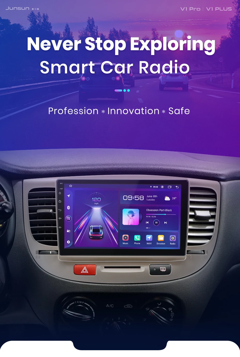 >> O rádio alternará entre os modos dia e noite usando faróis do carro para ajustar o brilho geral da tela para combinar com o ambiente circundante. Funções comuns são integradas na área de trabalho, permitindo que você alterne entre navegação, música, chamadas Bluetoo-th e outros recursos comuns com apenas um clique. O design personalizado da interface do usuário da Junsun aumenta a conveniência e a segurança durante toda a sua jornada;