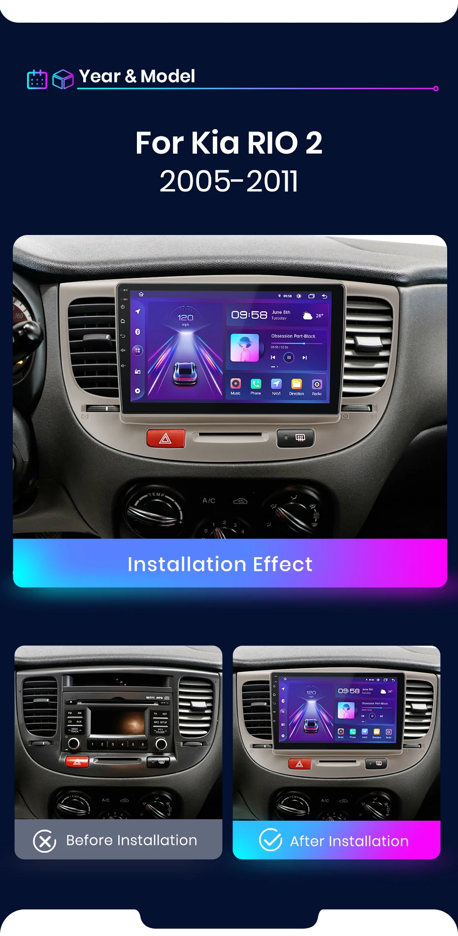 RD046 Android Kia kia rio 2 2005-2011 1GB a 8GB RAM e 16GB a 128GB ROM com ou sem Carplay