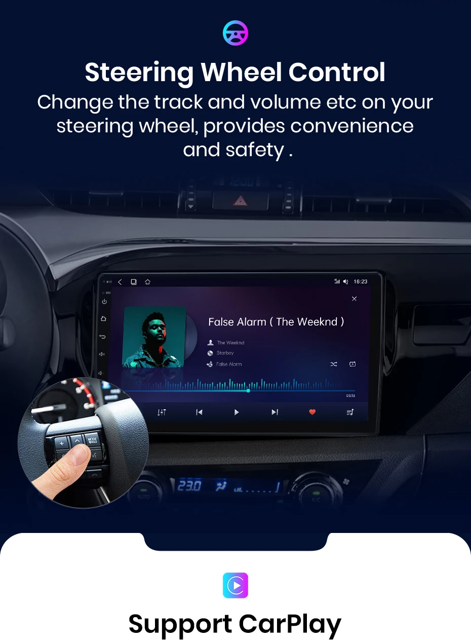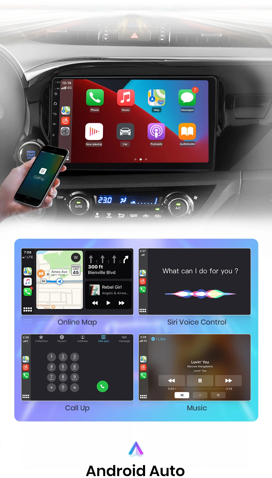 >> Basta conectar com o seu telefone que tornam possível para você acessar a navegação do mapa, contatos do telefone, notificação, música e muito mais. Você pode acordar siri ajuda a acessar essas funções, desta forma, você não só pode reduzir o tempo chato na condução, mas também aumentar significativamente o prazer de dirigir.