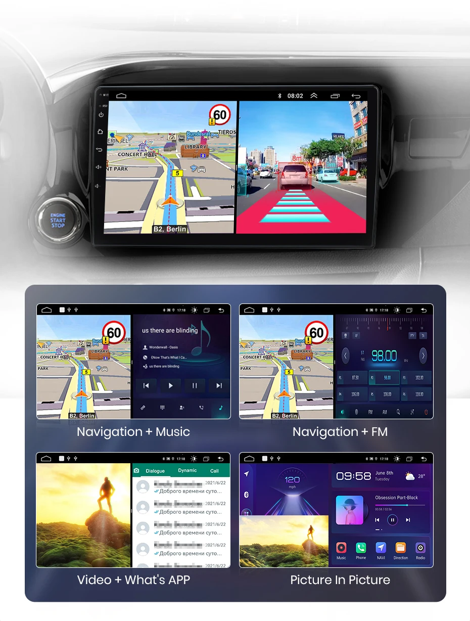 Você pode usar navegue e outras aplicações ao mesmo tempo, como ouvir música ou ligar as funções de adas dvr ect. Faça a operação mais conveniente.