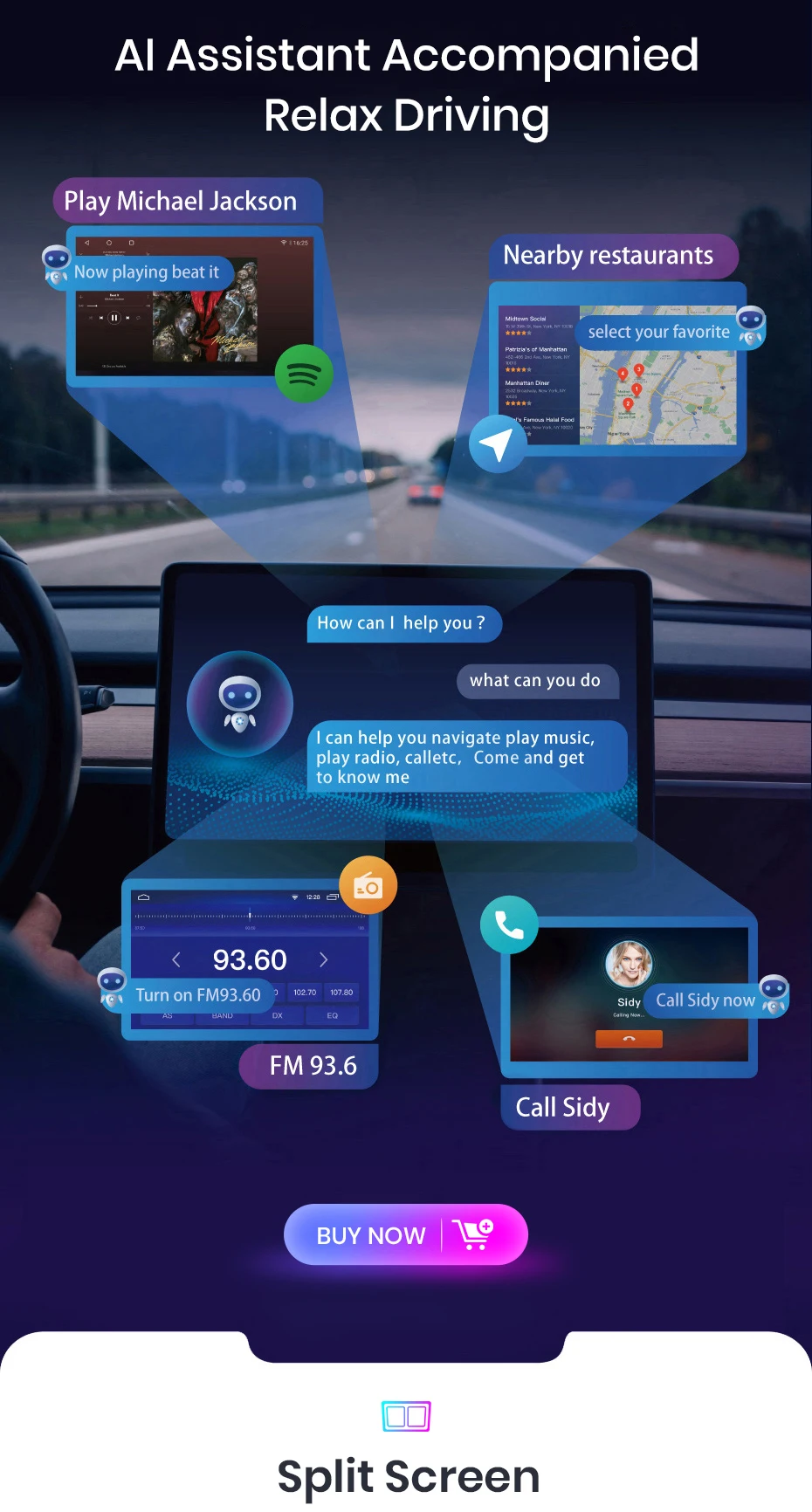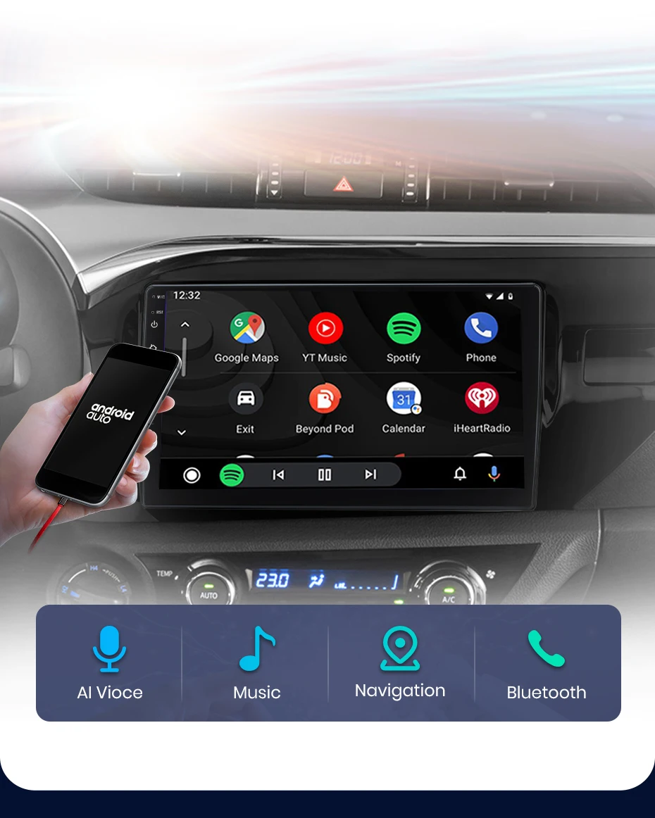 >>Built-in wired android automático, assistente de voz do google ajudará ao longo do seu dia. Fazer chamadas, verificar suas mensagens, responder de volta, usar aplicativos de música, tudo enquanto mantém as mãos no volante.