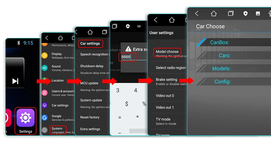2) se houver canbus no pacote, por favor conecte canbus em primeiro lugar, em seguida, consulte a imagem para definir o modelo de carro, em seguida, escolher a informação do carro certo, reiniciar, ele vai funcionar automaticamente;
