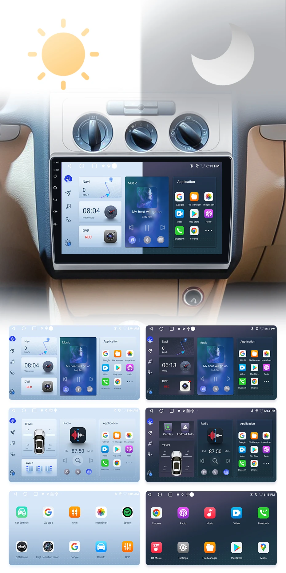 >> O rádio alternará entre os modos dia e noite usando faróis do carro para ajustar o brilho geral da tela para combinar com o ambiente circundante. Funções comuns são integradas na área de trabalho, permitindo que você alterne entre navegação, música, chamadas Bluetoo-th e outros recursos comuns com apenas um clique. O design personalizado da interface do usuário da Junsun aumenta a conveniência e a segurança durante toda a sua jornada;