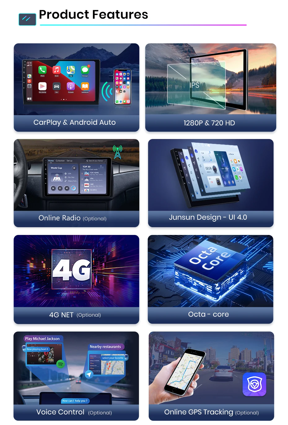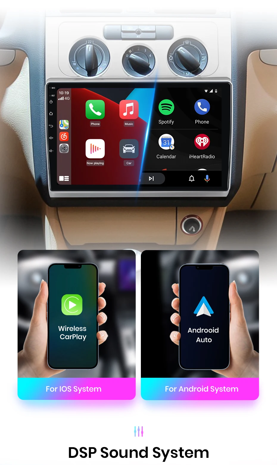 >> O rádio Junsun suporta Wireless CarPlay e Android Auto, permitindo que você use funções e aplicativos do smartphone, como navegação, música, chamadas e mensagens durante sua jornada. Proporciona uma experiência áudio de alta qualidade, melhorando o entretenimento e a conveniência da sua experiência de condução.