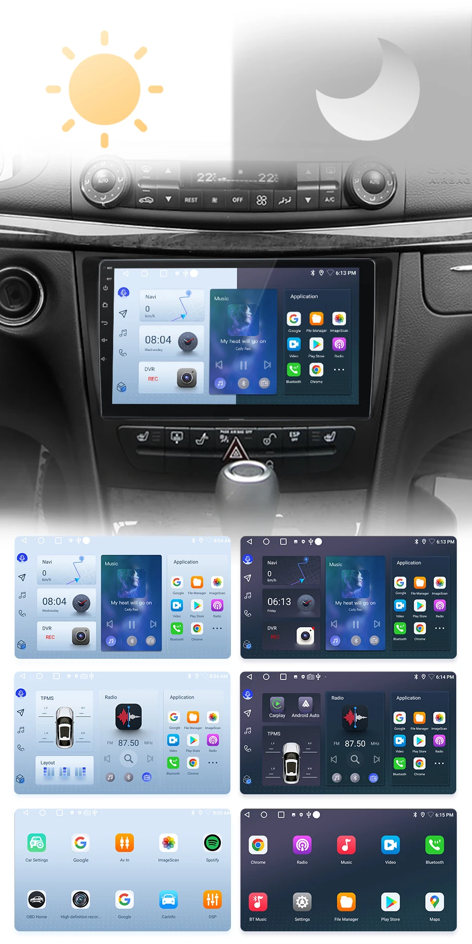 O rádio alternará entre os modos diurno e noturno usando os faróis do carro para ajustar o brilho geral da tela para combinar com o ambiente ao redor. Funções comuns são integradas na área de trabalho, permitindo que você alterne entre navegação, música, chamadas Bluetoo-th e outros recursos comuns com apenas um clique. O design personalizado da interface do usuário da Junsun aumenta a conveniência e a segurança durante toda a sua jornada;