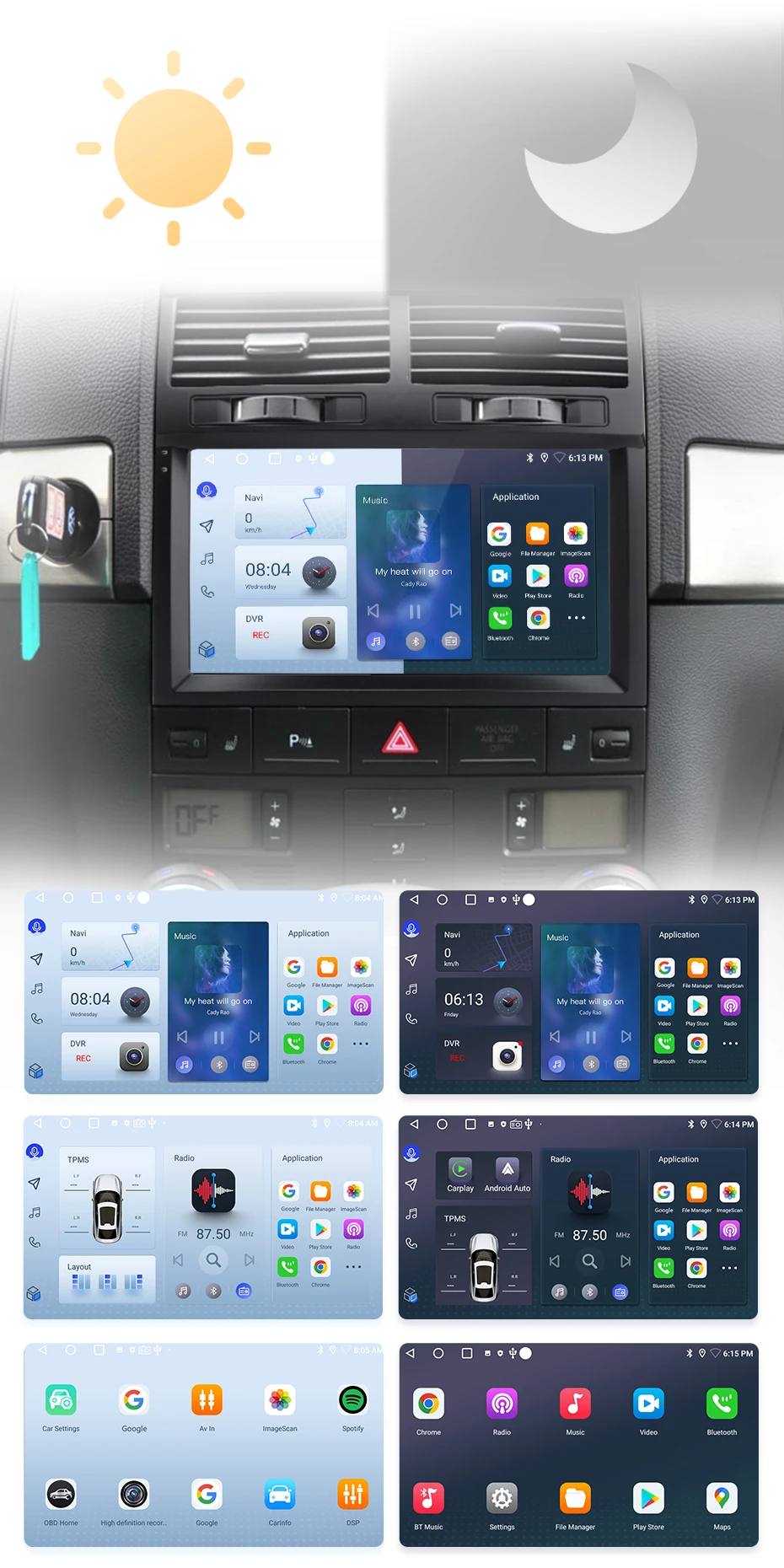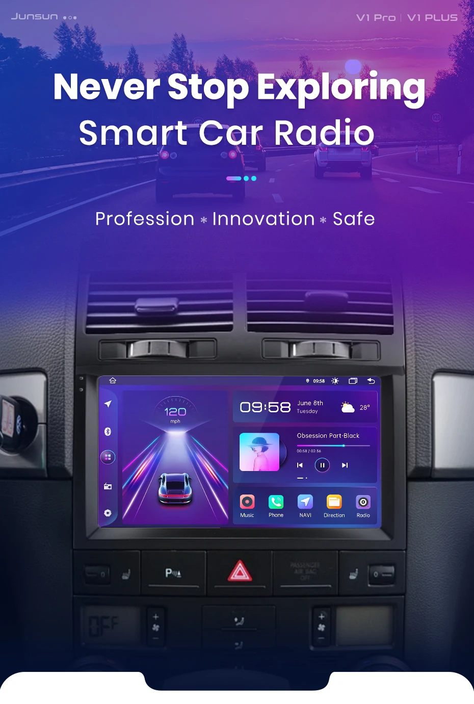 O rádio alternará entre os modos diurno e noturno usando os faróis do carro para ajustar o brilho geral da tela para combinar com o ambiente ao redor. Funções comuns são integradas na área de trabalho, permitindo que você alterne entre navegação, música, chamadas Bluetoo-th e outros recursos comuns com apenas um clique. O design personalizado da interface do usuário da Junsun aumenta a conveniência e a segurança durante toda a sua jornada;