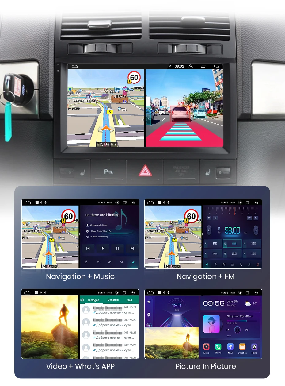 Desfrute de multitarefa superior, interface fácil de navegar, visuais aprimorados, configurações ajustáveis e controles sensíveis ao toque. Por exemplo, navegação para o motorista principal, reprodução de vídeo para o passageiro, ou um lado ouvindo música e outro lado ligando as funções ADAS dvr etc.