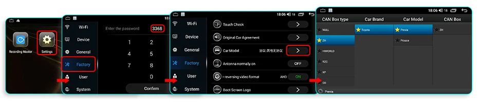 Configurações →factory→ 3368 →Car Model→escolha o carro certo information→reboot