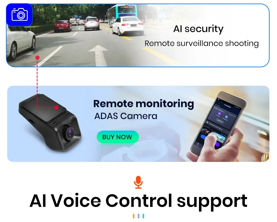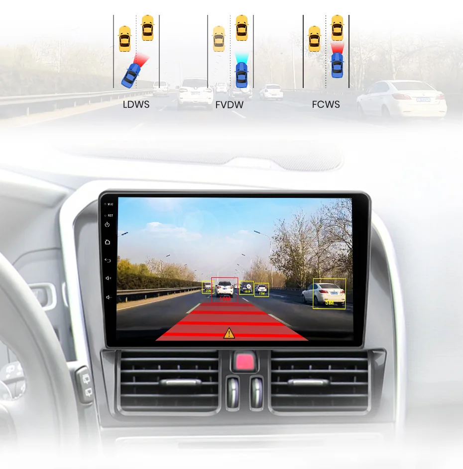 > Câmera ADAS DVR, monitoramento da pressão dos pneus, OBD2, microfone externo, cabo RCA.